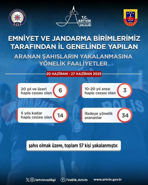 Artvin Emniyet ve Jandarma birimleri 57 aranan şahsı yakalayarak suçlulara karşı mücadeleyi kararlılıkla sürdürdüklerini duyurdu