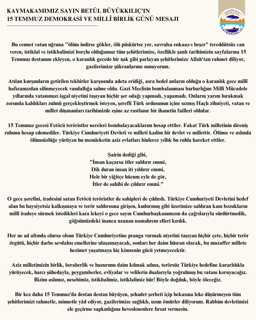 Borçka Kaymakamı Büyükkılıç’ın “15 Temmuz Demokrasi ve Milli Birlik Günü” mesajı 6 ay önce Fatma KÜÇÜK ATASERT tarafından 8 2 Facebook'ta Paylaş Tweet'le Google +1 Pınterest Mail ← Geri İleri →