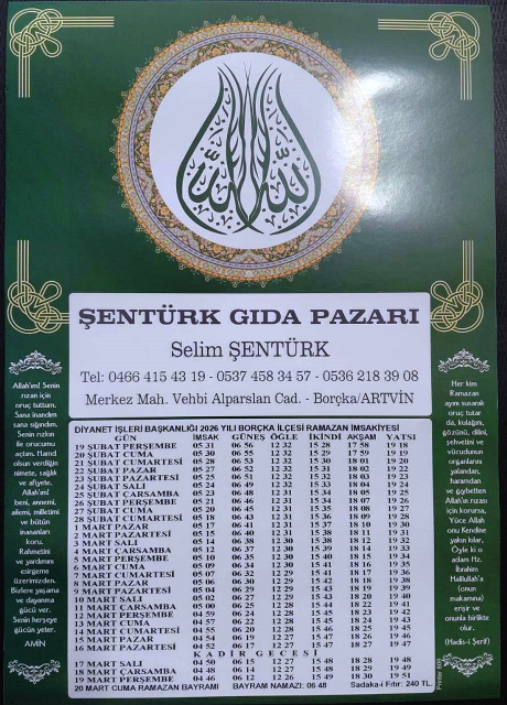 2026 yılı Ramazan İmsakiyesi baskı işinde bizleri tercih eden ŞENTÜRK GIDA PAZARI – SELİM ŞENTÜRK’e teşekkür eder, hayırlı Ramazanlar ve bereketli kazançlar dileriz.